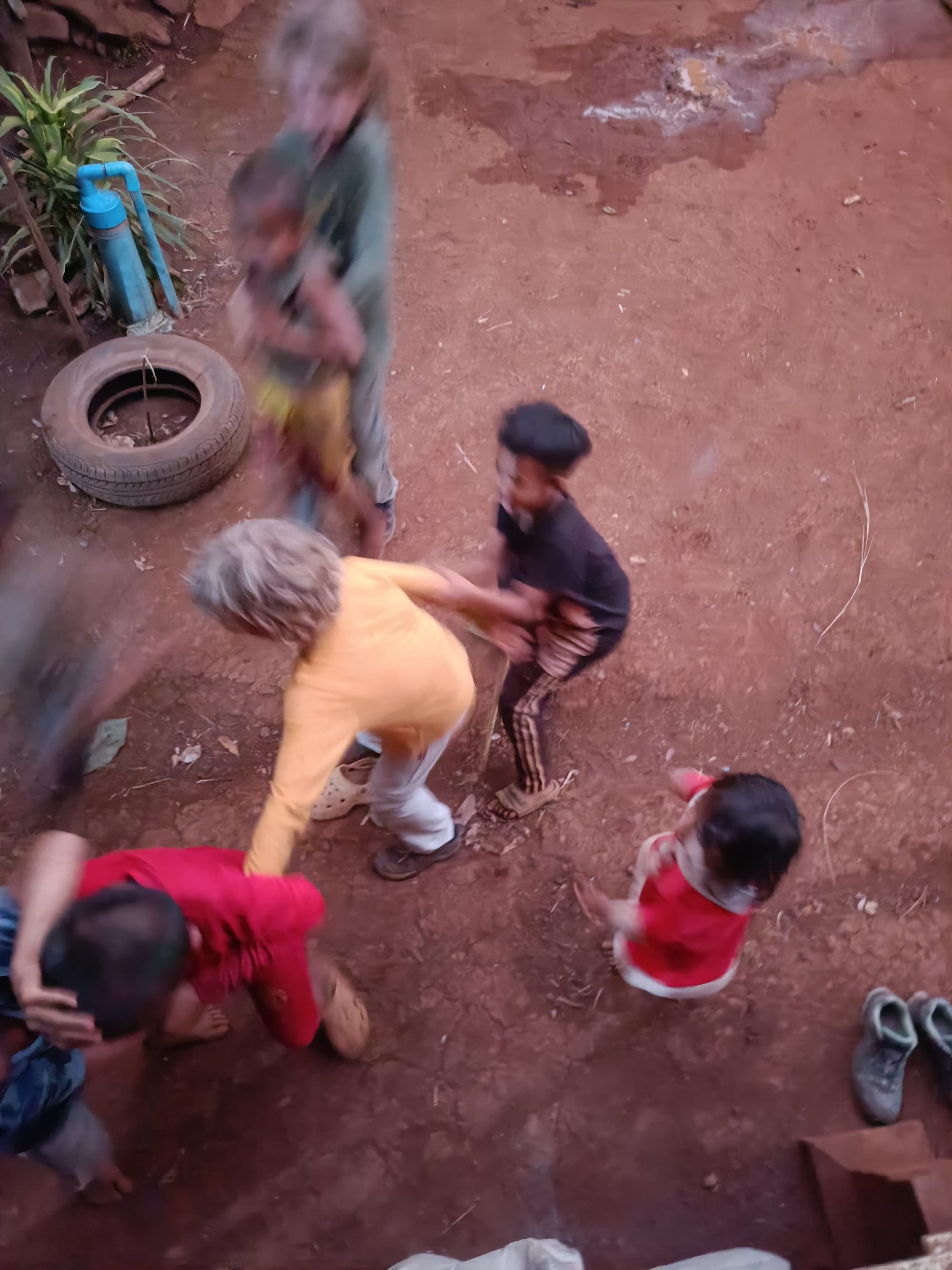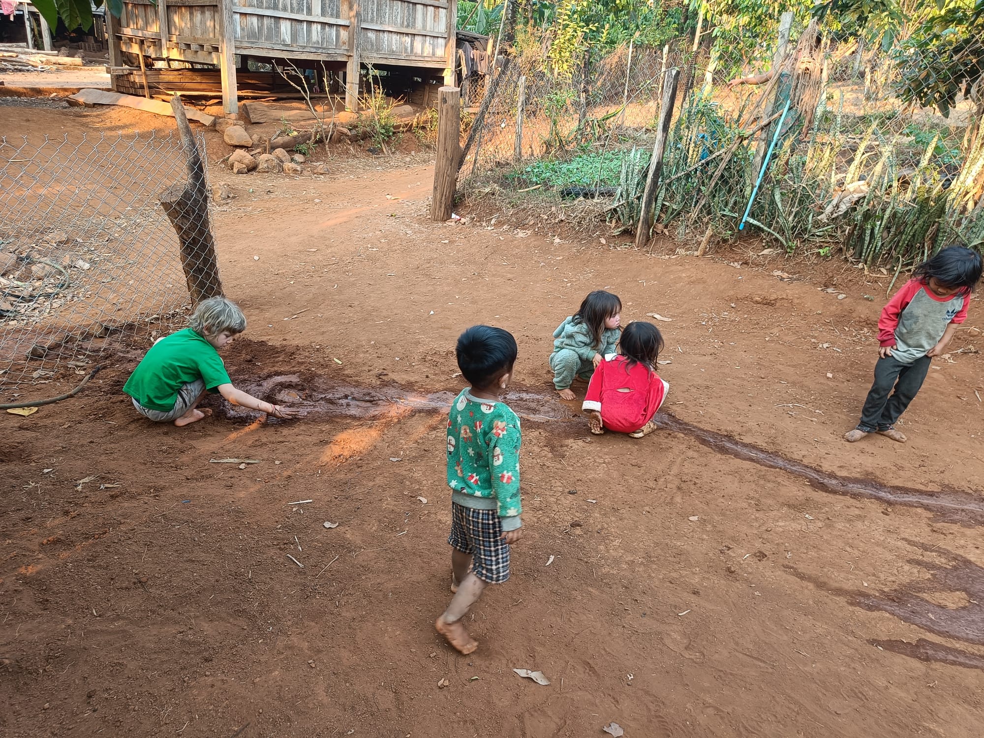 On a dormi chez mister Somphone et Dak. Ils habitent dans un petit village. A midi, j'ai aidé à préparer une omelette. Après, j'ai joué avec les enfants du village au foot et on a construit un circuit d'eau. Le soir, j'ai joué sur un vieux tracteur et on a fait la bagarre pour s'amuser avec les enfants du village.