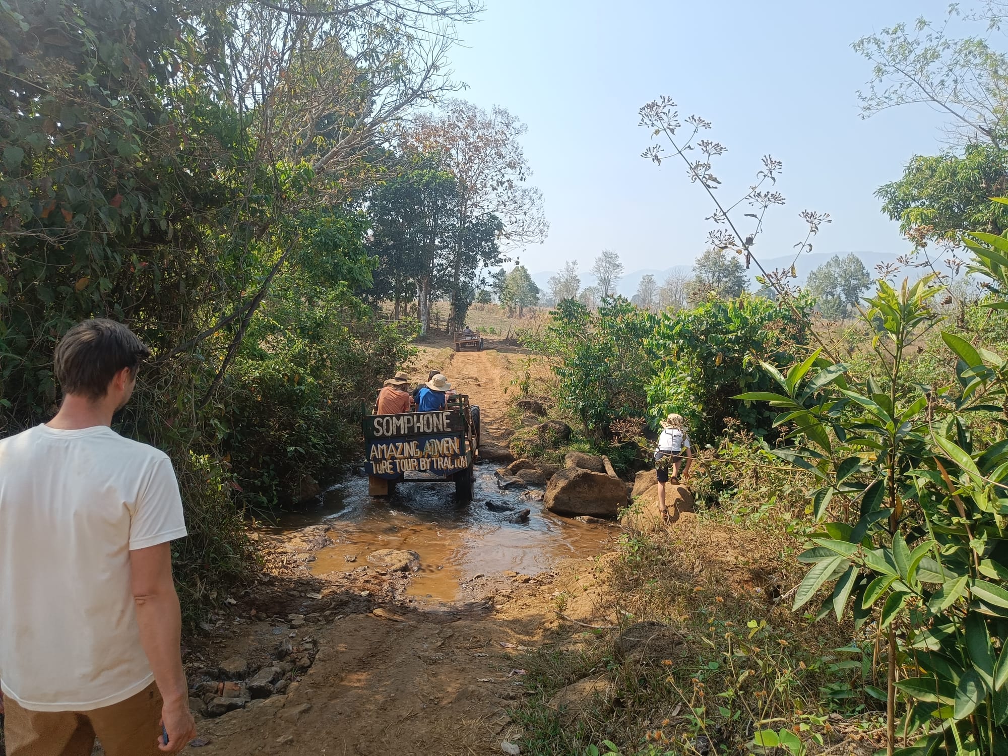 Le lendemain matin, on a fait un tour en vieux tracteur avec Somphone. On a trouvé une banane toute séchée et on a ramassé des amandes.
