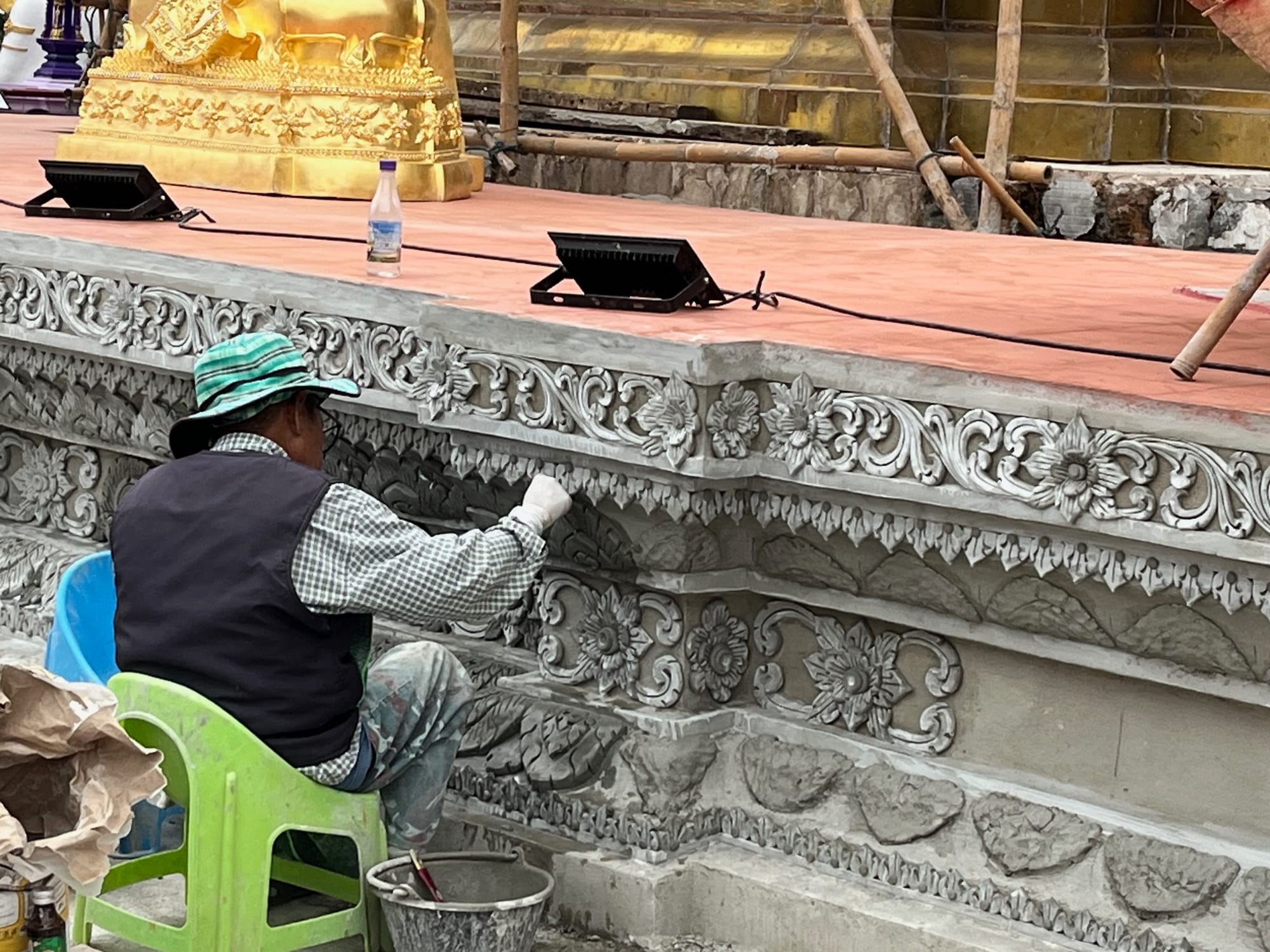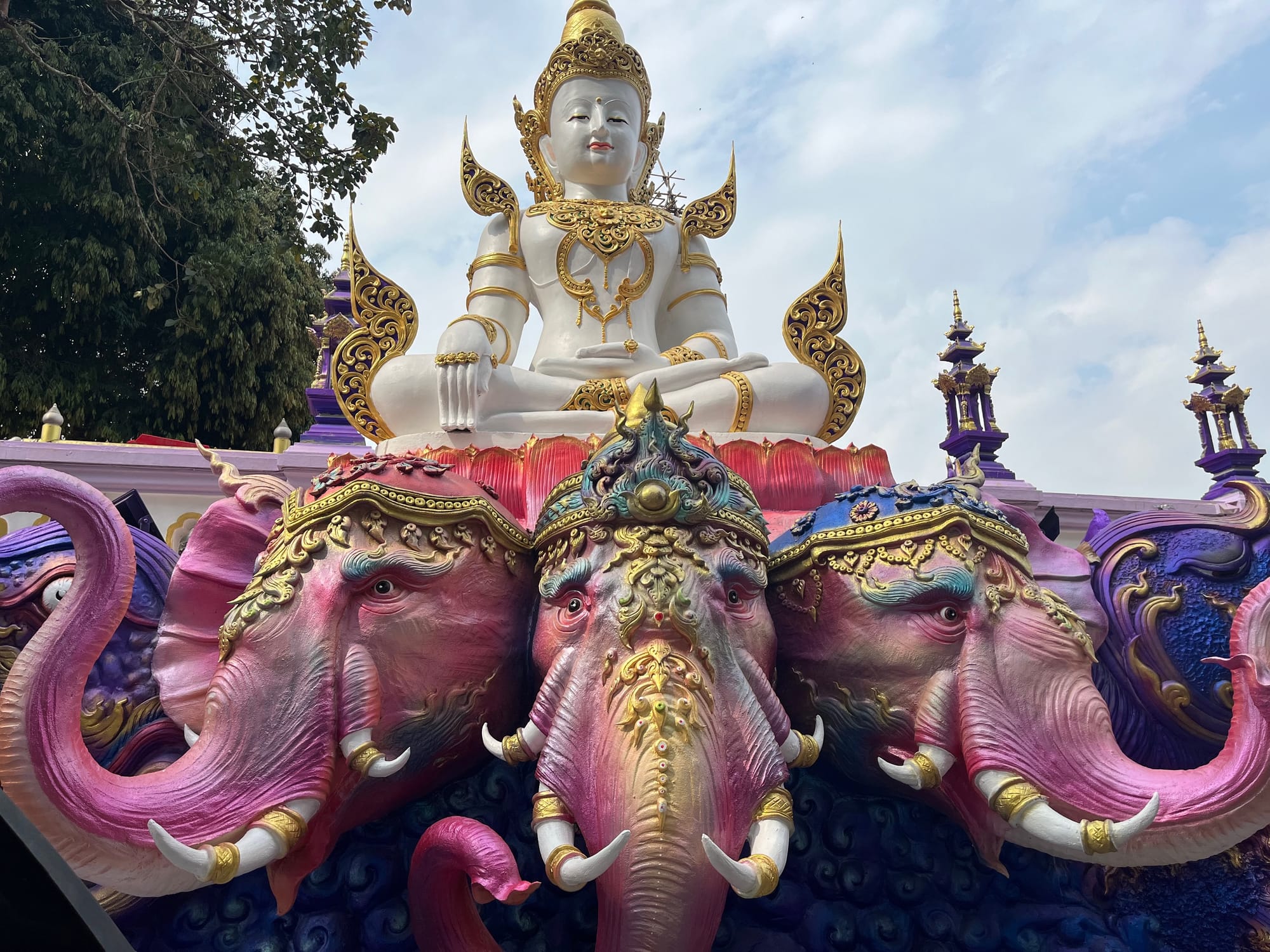 Ensuite, on visite la ville frontalière de Mae Sae qui se trouve le plus au nord de la Thaïlande et nous nous rendons au temple qui a construit un Sky Walk. Ici le temple ressemble à un véritable décor de parc d’attractions avec une petite musique d’ambiance.